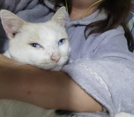 Besonders anhänglicher Kater, sehr verschmust. Er möchte am liebsten den ganzen Tag an der Seite von Menschen sein.
